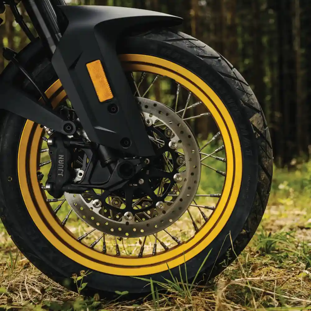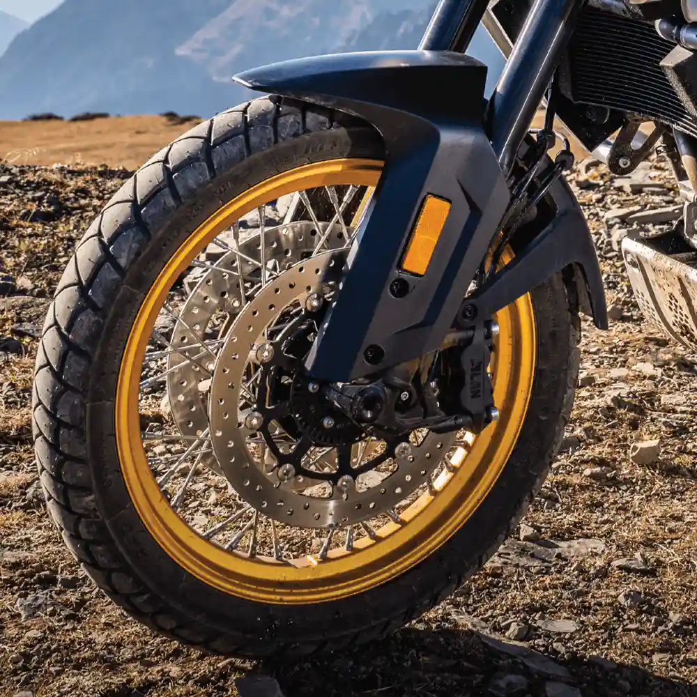 Jantes en alliage 19″ à l’avant et 17″ à l’arrière, montées avec pneus Michelin Anakee Adventure (110/80 R19 avant, 150/70 R17 arrière) pour l’adhérence sur route et hors route.