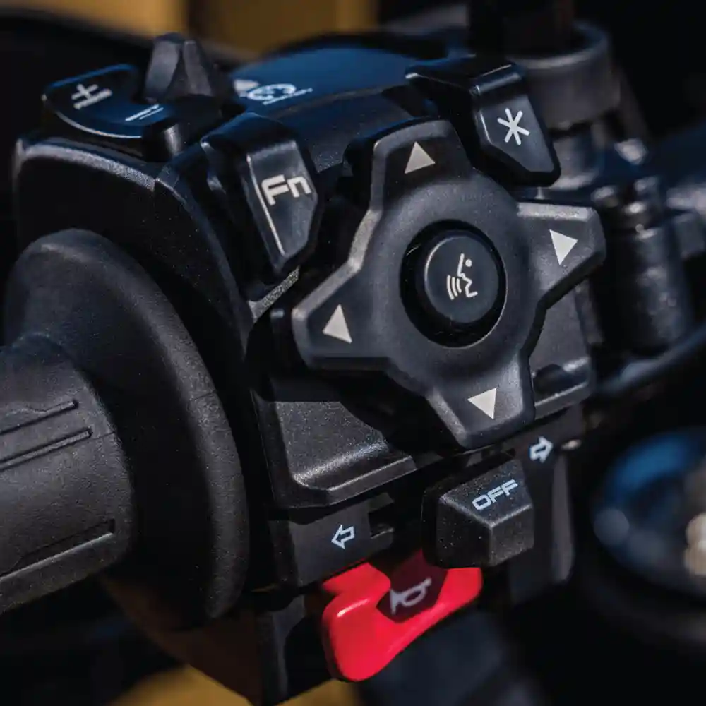 Écran tactile MMI de 8 po avec Bluetooth, Apple CarPlay, RideSync™, écran rétroéclairé, radar arrière, détection d’angle mort, régulateur de vitesse, quickshifter bidirectionnel, avertisseur d’arrêt d’urgence, commandes de stabilité, freinage assisté, port USB-C et pare-brise réglable.