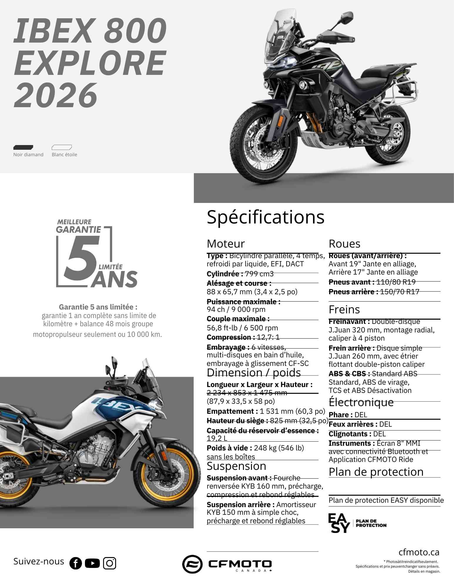 Garantie 5 ans limitée : 1 an complète sans limite de kilométrage + balance 48 mois groupe motopropulseur seulement, ou 10 000 km.