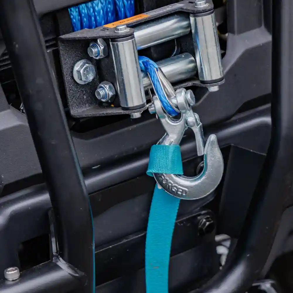 Plateau arrière basculant avec assistance à gaz, treuil 3 500 lb, prises 12 V et port USB, toit rigide, rétroviseurs et tableau de bord TFT connecté avec Bluetooth — prêt à affronter tous les défis.