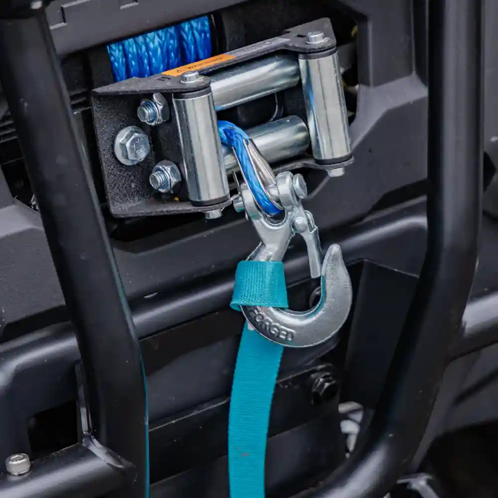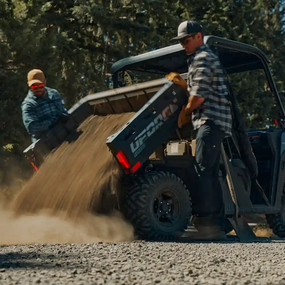 Plateau arrière basculant 250 kg (≈551 lb), treuil 3 500 lb, prises 12 V et port USB-C, rétroviseurs, toit rigide et tableau de bord LCD — prêt à l’emploi dès la sortie de l’atelier.