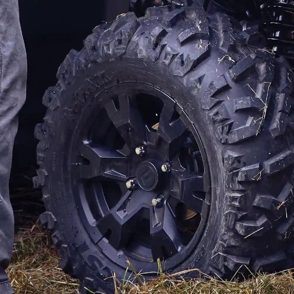 Jantes alu 14 po aux deux positions ; pneus tubeless 27×9-14 à l’avant et 27×11-14 à l’arrière.