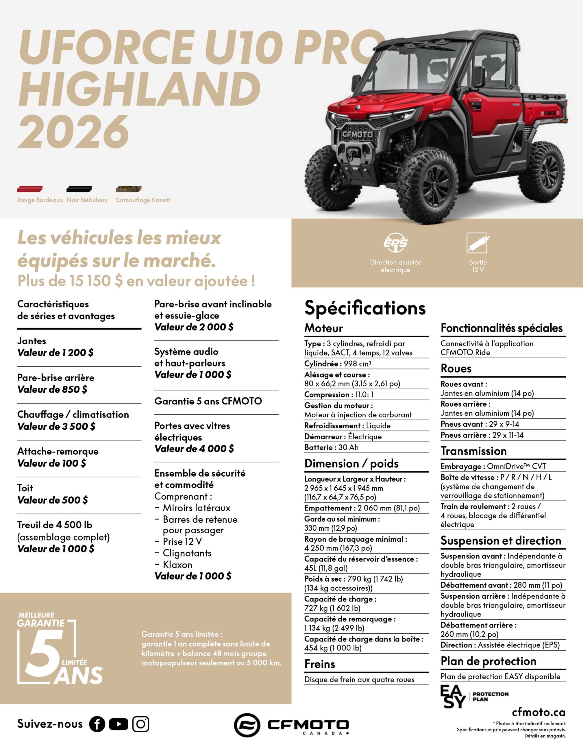 Le CFMOTO UFORCE U10 PRO HIGHLAND CAMO 2026 est un côte-à-côte utilitaire de nouvelle génération, conçu pour les environnements exigeants en montagne, en forêt comme sur les grands domaines. Avec son moteur 3 cylindres 998 cm³, sa cabine fermée entièrement équipée (chauffage, climatisation, vitres électriques) et sa capacité de travail impressionnante, il combine robustesse, confort premium et technologie moderne, tout en offrant plus de 15 150 $ en valeur ajoutée d’équipements de série.